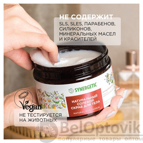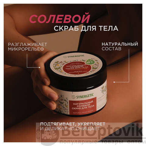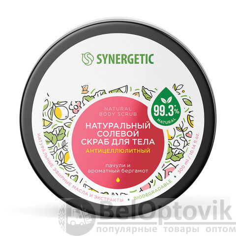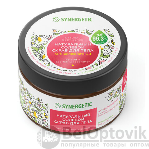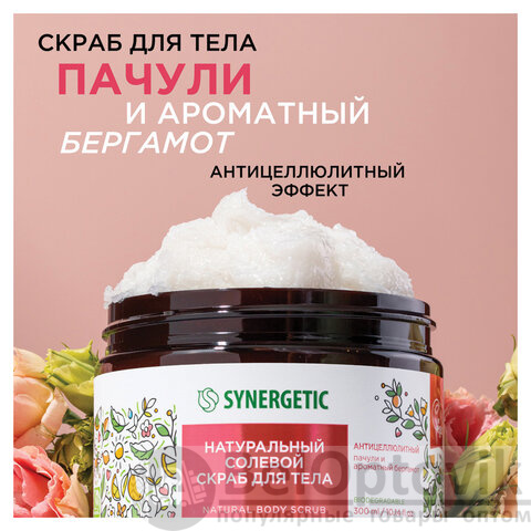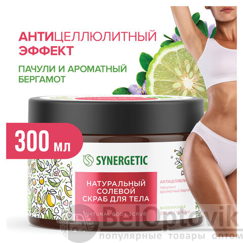 Натуральный солевой скраб для тела SYNERGETIC антицеллюлитный "Пачули и ароматный бергамот" – это эффективное средство для ухода за кожей, состоящее из натуральных компонентов.