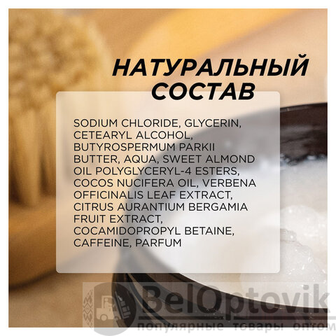 Состав: Sodium Chloride, Glycerin, Cetearyl Alcohol, Butyrospermum Parkii Butter, Aqua, Sweet Almond Oil Polyglyceryl-4 Esters, Cocos Nucifera Oil, Verbena Officinalis Leaf Extract, Citrus Aurantium Bergamia Fruit Extract, Cocamidopropyl Betaine, Glyceryl Oleate, Сaffeine, Parfum, Sodium Benzoate, Potassium Sorbate, Citric Acid.