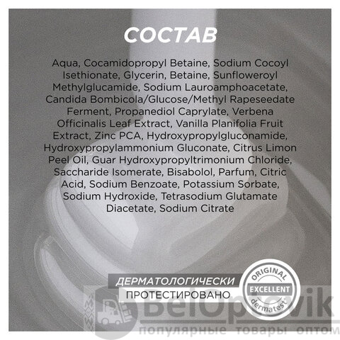 Состав: Aqua, Cocamidopropyl Betaine, Sodium Cocoyl Isethionate, Glycerin, Betaine, Sunfloweroyl Methylglucamide, Sodium Lauroamphoacetate, Candida Bombicola/Glucose/Methyl Rapeseedate Ferment, Propanediol Caprylate, Verbena Officinalis Leaf Extract, Vanilla Planifolia Fruit Extract, Zinc PCA, Hydroxypropylgluconamide, Hydroxypropylammonium Gluconate, Citrus Limon Peel Oil, Guar Hydroxypropyltrimonium Chloride, Saccharide Isomerate, Bisabolol, Parfum, Сitric Acid, Sodium Benzoate, Potassium Sorbate, Sodium Hydroxide, Tetrasodium Glutamate Diacetate, Sodium Citrate.