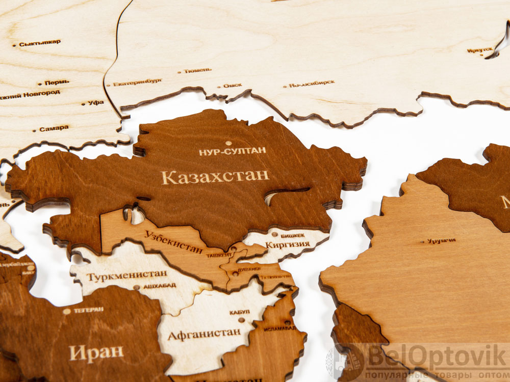 Карта максимально детализирована: города, столицы, границы и названия четко выделяются и легко различимы благодаря гравировке. Страны имеют разный оттенок бежевого, чтобы их было проще визуально отличить друг от друга издали.