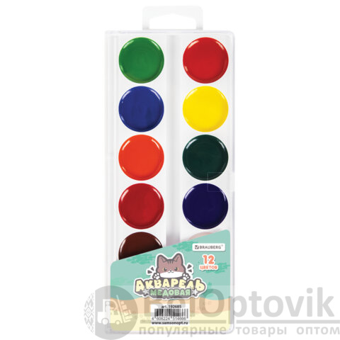 Краски акварельные BRAUBERG "МИЛЫЕ КОТЫ", медовые, 12 цветов, круглые кюветы, 192685