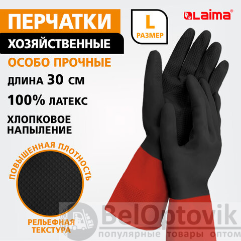 Перчатки МНОГОРАЗОВЫЕ латексные LAIMA "БИКОЛОР", черно-красные, ОСОБО ПРОЧНЫЕ, хлопковое напыление, размер L (большой), вес 60 г, 700539