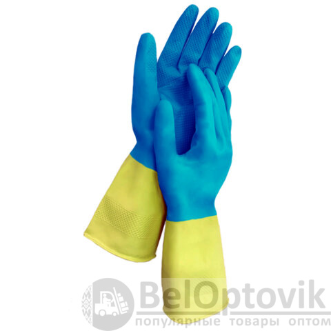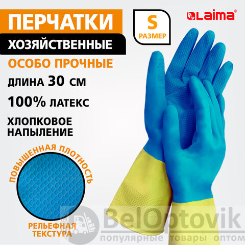 Перчатки МНОГОРАЗОВЫЕ латексные LAIMA "БИКОЛОР", сине-желтые, ОСОБО ПРОЧНЫЕ, хлопковое напыление, размер S (малый), вес 52 г, 700541