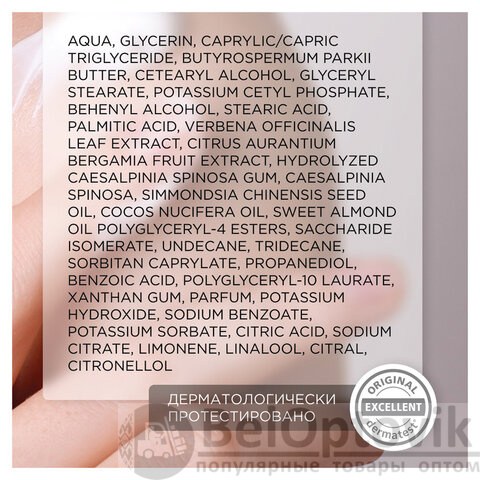 Состав ГОСТ: Aqua, Glycerin (растительный увлажнитель), Caprylic/Capric Triglyceride (смягчающий кожу эмолент на основе пальмового и кокосового масел), Butyrospermum Parkii Butter (масло карите), Cetearyl Alcohol (натуральный эмульгатор), Glyceryl Stearate (натуральный эмульгатор), Potassium Cetyl Phosphate (увлажняющий эмульгатор, структурообразователь), Behenyl Alcohol (натуральный загуститель), Stearic Acid, Palmitic Acid (натуральный эмульгатор, смягчающий компонент), Verbena Officinalis Leaf Extract (экстракт вербены), Citrus Aurantium Bergamia Fruit Extract (экстракт бергамота), Hydrolyzed Caesalpinia Spinosa Gum, Caesalpinia Spinosa Gum (галакто-, манно-, олигосахариды, пребиотики), Simmondsia Chinensis Seed Oil (масло жожоба), Cocos Nucifera Oil (масло кокоса), Sweet Almond Oil Polyglyceryl-4 Esters (водорастворимое масло миндаля), Saccharide Isomerate (увлажняющий актив), Undecane, Tridecane (натуральный эмолент), Sorbitan Caprylate (натуральный эмульгатор), Propanediol (увлажняющий компонент), Benzoic Acid (природный консервант), Polyglyceryl-10 Laurate (натуральный стабилизатор эмульсий), Xanthan Gum (ксантановая камедь), Parfum (отдушка), Potassium Hydroxide (регулятор кислотности), Sodium Benzoate, Potassium Sorbate (природные консерванты), Citric Acid, Sodium Citrate, Limonene, Linalool, Citral, Citronellol (ароматические вещества, компоненты отдушки).