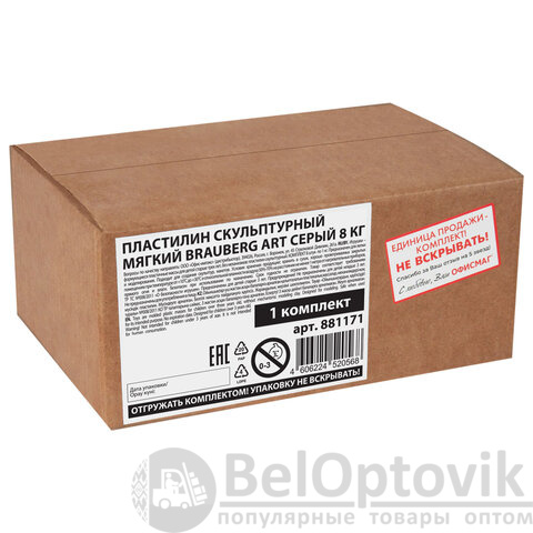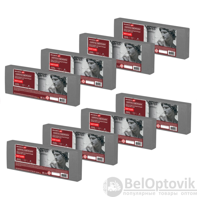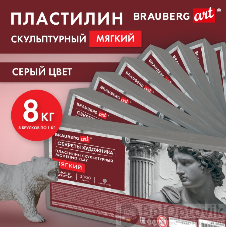 Набор из 8 брусков по 1 кг пластилина, цвет серый. Отлично держит форму и устойчив к перепадам температуры. Не оставляет пятен, не липнет к рукам. Мягкий скульптурный пластилин более удобен в работе и подойдет даже любителям. Оптимальное для работы скульпторов соотношение мягкости и твердости материала, хорошая пластичность, естественные цвета. Каждый брусок весом 1 кг упакован в термоусадочную пленку и далее бруски упакованы в гофрированную коробку.