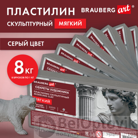 Пластилин скульптурный мягкий серый BRAUBERG ART "Секреты художника", 8 кг, 881171