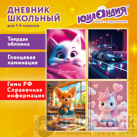 Дневник 1-4 класс 48 л., твердый, ЮНЛАНДИЯ, глянцевая ламинация, с подсказом, "МИКС", 107580