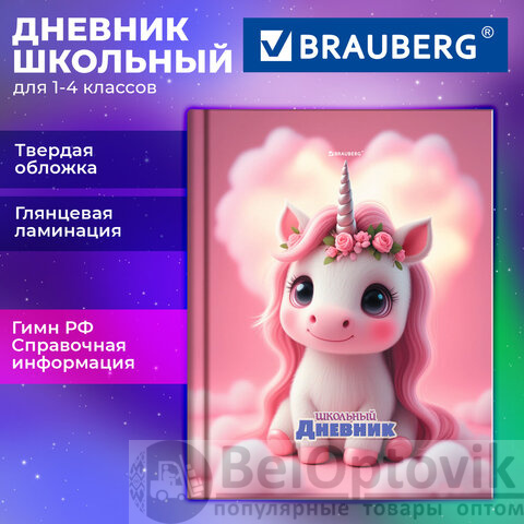 Дневник 1-4 класс 48 л., твердый, BRAUBERG, глянцевая ламинация, с подсказом, "Единорог", 107588