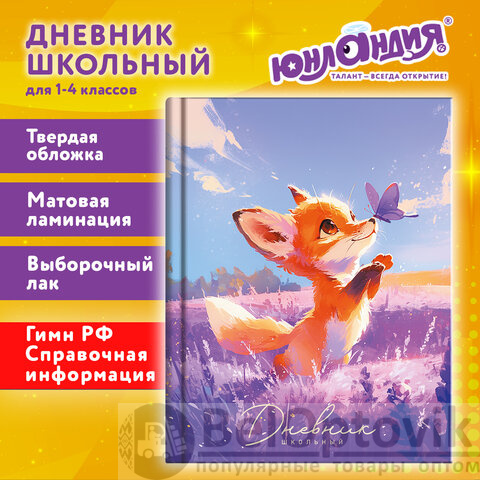 Дневник 1-4 класс 48 л., твердый, ЮНЛАНДИЯ, выборочный лак, с подсказом, "Лисёнок", 107596