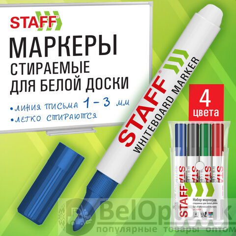 Маркеры стираемые для белой доски НАБОР 4 ЦВЕТА, STAFF "BASIC" WBM-200, 1-3 мм, 152639