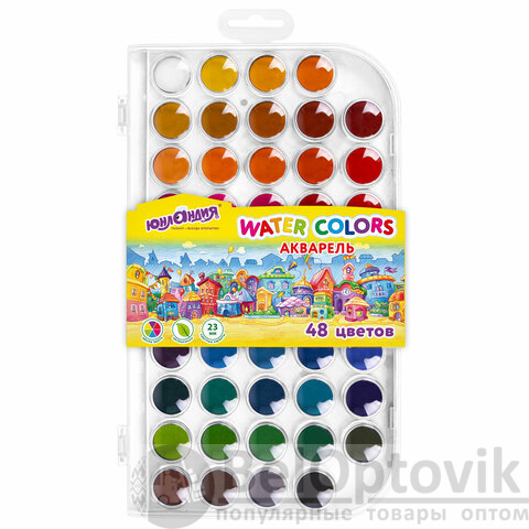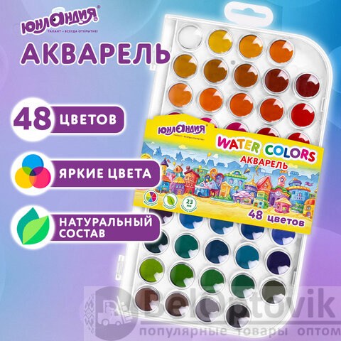 Краски акварельные ЮНЛАНДИЯ "ДОМИКИ", 48 цветов, круглые кюветы 23 мм, пенал, 192634