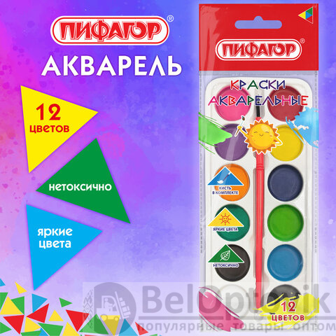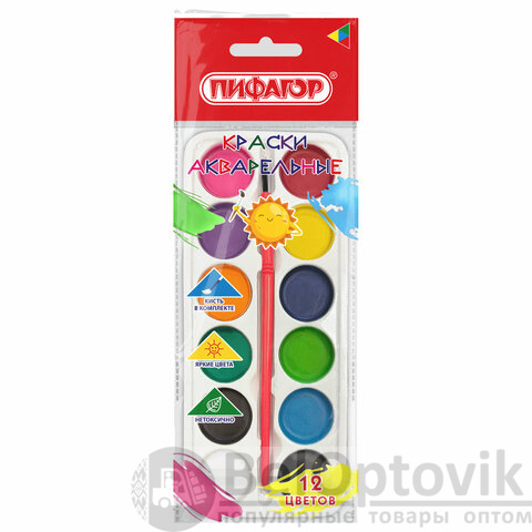 Краски акварельные ПИФАГОР "СОЛНЫШКО", 12 цветов, круглые кюветы, на коррексе, 192636