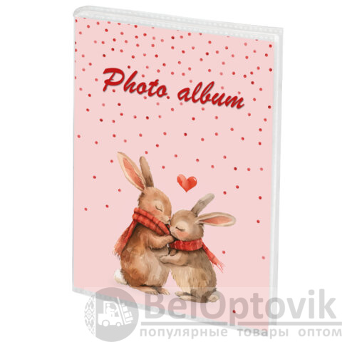 Состоит из 18 полипропиленовых листов размером 11,5х15,15 см с карманами и вмещает 36 фотографий размером 10х15 см по 1 штуке на странице. Обложка фотоальбома выполнена в розовых тонах с изображением кроликов, а его листы склеены в единый блок. Размер - 12х16 см.