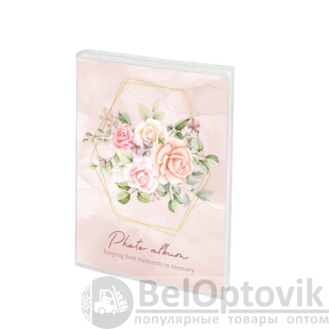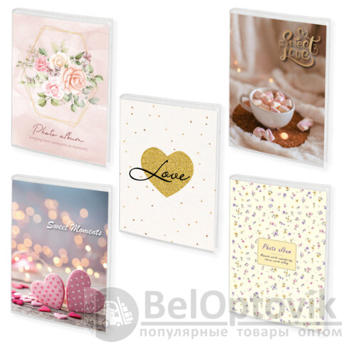 Состоит из 18 полипропиленовых листов размером 11,5х15,15 см с карманами и вмещает 36 фотографий размером 10х15 см по 1 штуке на странице. Обложка фотоальбома представлена в 5 дизайнах. Листы склеены в единый блок. Размер - 12х16 см.