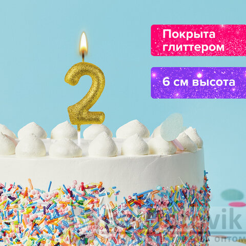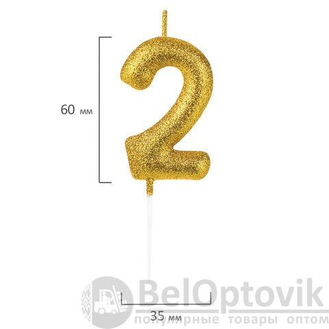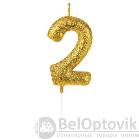 Свеча золотистого цвета декорирована глиттером и представляет собой цифру "2". Выполнена из парафина и укомплектована пластиковым держателем-шпажкой для удобства размещения цифры в торте или другом кондитерском изделии. Высота свечи - 6 см, длина шпажки - 4,5 см.