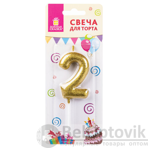Свеча-цифра для торта "2" золотая с глиттером, 6 см, ЗОЛОТАЯ СКАЗКА, на шпажке, в блистере, 591415