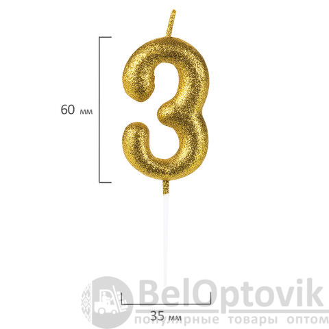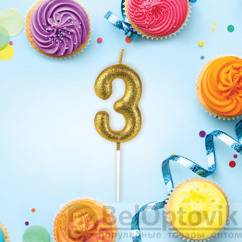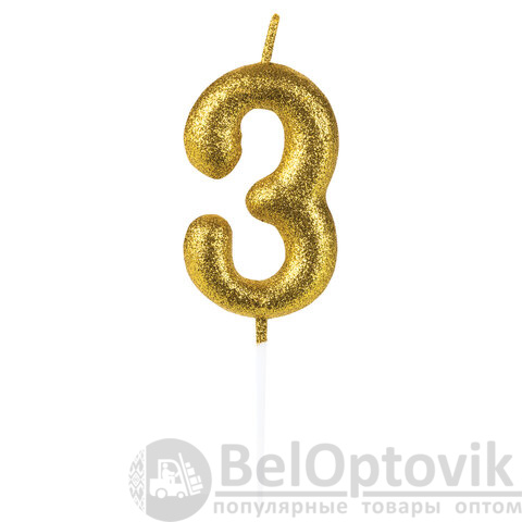 Свеча золотистого цвета декорирована глиттером и представляет собой цифру "3". Выполнена из парафина и укомплектована пластиковым держателем-шпажкой для удобства размещения цифры в торте или другом кондитерском изделии. Высота свечи - 6 см, длина шпажки - 4,5 см.