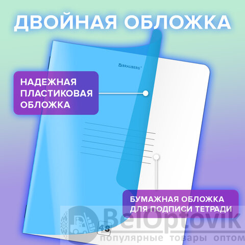 Тетрадь формата А5 с двойной обложкой: внешняя выполнена из высококачественного износостойкого полупрозрачного пластика неоново-синего цвета, внутренняя – из качественной офсетной бумаги 110 г/м2. Преимущество таких тетрадей заключается в том, что для сохранения внешнего вида не нужно покупать дополнительную обложку.