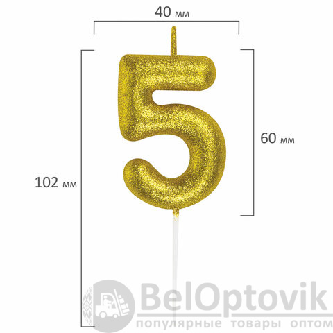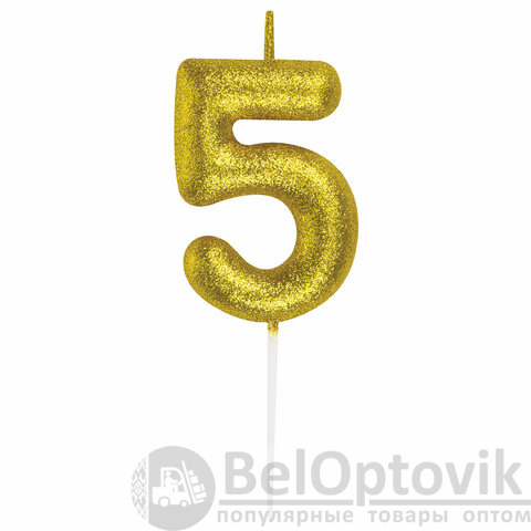 Свеча золотистого цвета декорирована глиттером и представляет собой цифру "5". Выполнена из парафина и укомплектована пластиковым держателем-шпажкой для удобства размещения цифры в торте или другом кондитерском изделии. Высота свечи - 6 см, длина шпажки - 4,5 см.