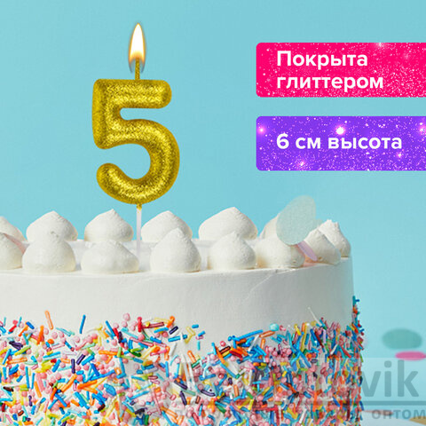 Свеча-цифра для торта "5" золотая с глиттером, 6 см, ЗОЛОТАЯ СКАЗКА, на шпажке, в блистере, 591418