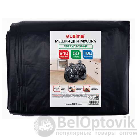 Мешки для мусора 240 л, черные, в пласте 50 штук, сверхпрочные, ПВД 80 мкм, 90x120 см, LAIMA, 702682