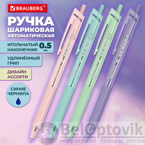 Ручка шариковая автоматическая с грипом BRAUBERG "CLASSIC PASTEL", СИНЯЯ, корпус ассорти, пишущий узел 0,5 мм, линия письма 0,35 мм, 144468
