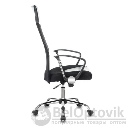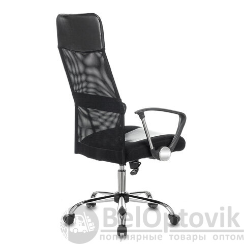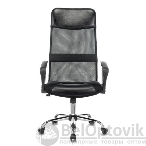 Каркас спинки кресла выполнен из прочного металла и обтянут износоустойчивой сеткой, обеспечивающей циркуляцию воздуха. Обивка сиденья представлена в комбинации экокожи и объемной мебельной ткани TW.