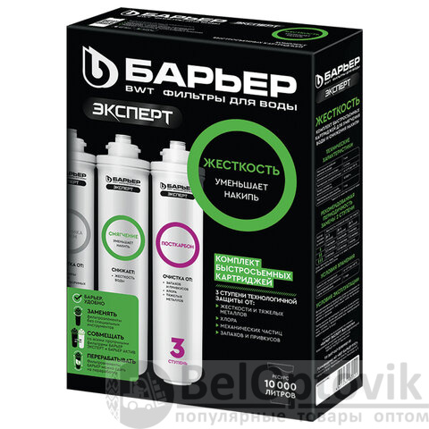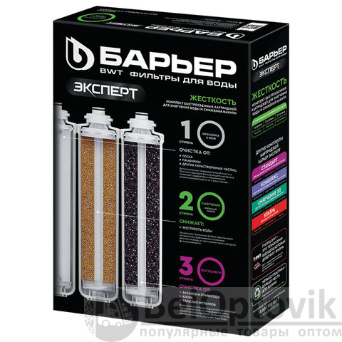 Сменные быстросъемные картриджи для проточного фильтра БАРЬЕР ЭКСПЕРТ. Комплект сменных картриджей БАРЬЕР ЭКСПЕРТ Жесткость позволяет забыть о накипи в чайнике, очищает воду от тяжелых металлов, хлора, посторонних привкусов и запахов. Производительность – 2 л/мин, ресурс – 10 000 литров.