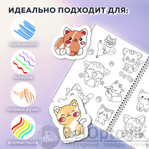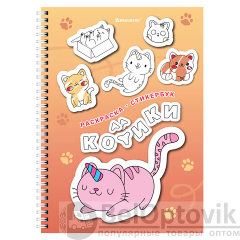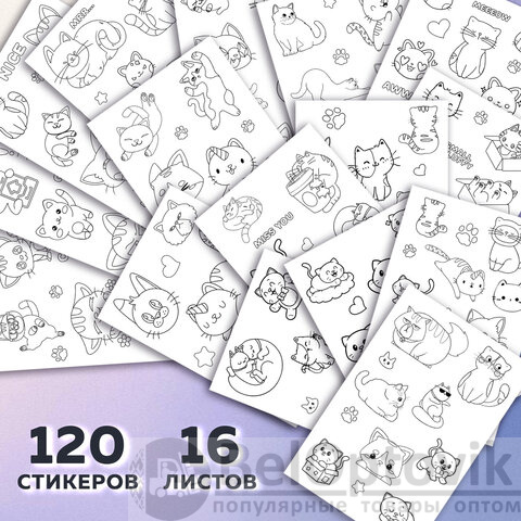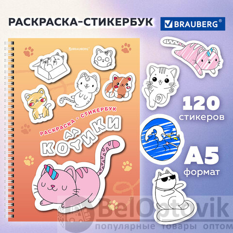Стикербук РАСКРАСЬ И НАКЛЕЙ А5, 16 листов, 120 стикеров, на гребне, BRAUBERG, "Котики", 666048