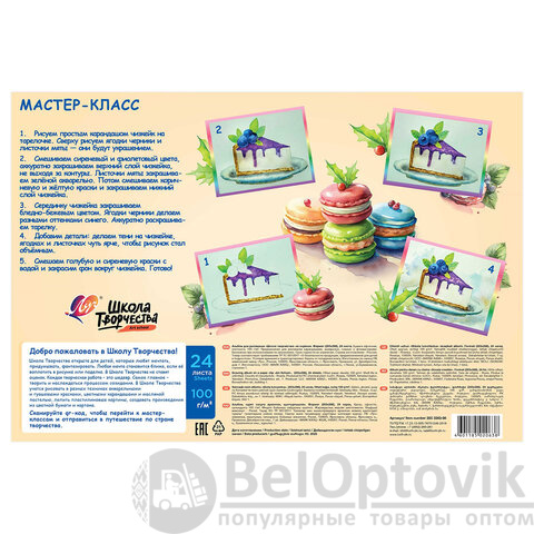 Содержит 24 листа плотностью 100 г/м2 формата А4 (288х203 мм). Красочная обложка выполнена из мелованного картона. Скрепление листов осуществляется с помощью скрепки. Подходит для смешанных техник рисования: красками, карандашами и фломастерами, ручками, углем, сухой и масляной пастелью и для других сухих материалов.
