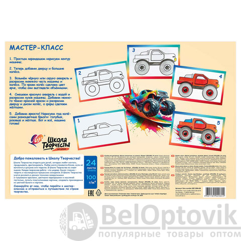 Содержит 24 листа плотностью 100 г/м2 формата А4 (288х203 мм). Красочная обложка выполнена из мелованного картона. Скрепление листов осуществляется с помощью скрепки. Подходит для смешанных техник рисования: красками, карандашами и фломастерами, ручками, углем, сухой и масляной пастелью и для других сухих материалов.
