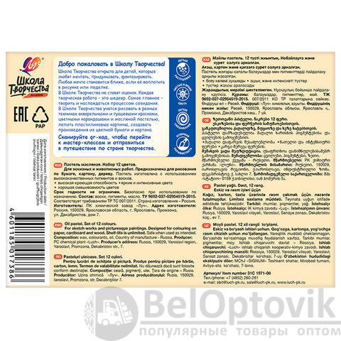Пастель масляная ЛУЧ "Школа творчества", 12 цветов, трехгранная, картонная упаковка, 31С 1971-08