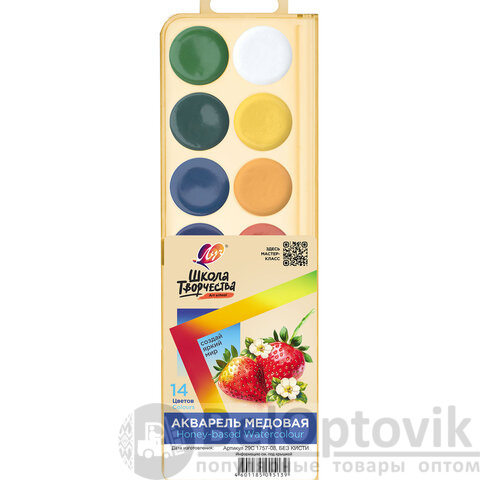 Краски акварельные изготовлены на основе органических пигментов и натурального связующего с добавлением пчелиного мёда. Предназначены для детского творчества и различных живописных работ. Отличаются хорошей прозрачностью, яркостью и чистотой цвета.