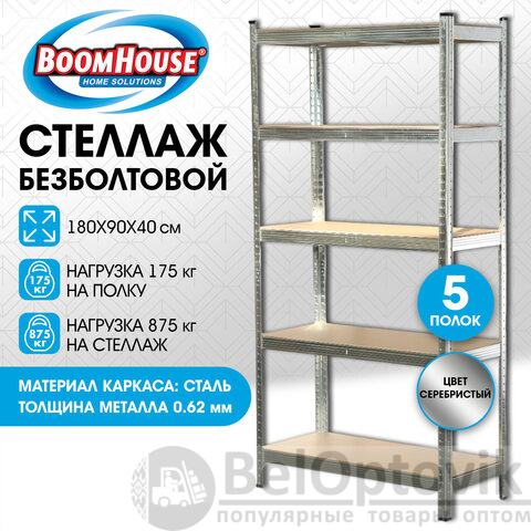 Стеллаж металлический BOOMHOUSE (БУМХАУС) безболтовой, 1800x900x400 мм, 5 полок МДФ, серебристый, 291412