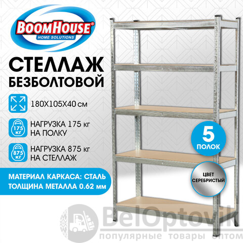 Стеллаж металлический BOOMHOUSE (БУМХАУС) безболтовой, 1800x1050x400 мм, 5 полок МДФ, серебристый, 291413