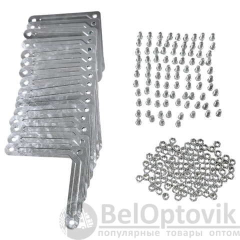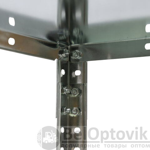 Для повышения жесткости всей конструкции верхнюю и нижнюю полку нужно усилить дополнительными Г-образными уголками (поставляются в комплекте 16 шт.). Промежуточные полки собираются без усиления.