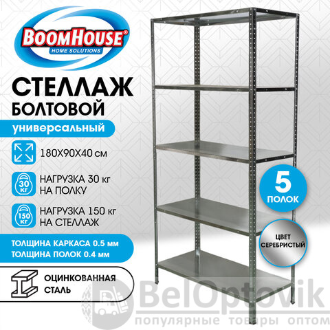Стеллаж металл BOOMHOUSE (БУМХАУС) в1800*ш900*г400мм, 5 полок, нагрузка на стеллаж до 150 кг, серебристый, 291421