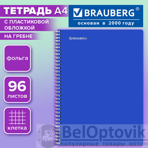 Тетрадь обложка пластик, А4, 96 л., гребень, клетка, фольга, МИНПРОМТОРГ, BRAUBERG, синяя, 405653