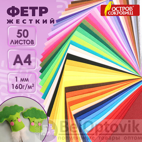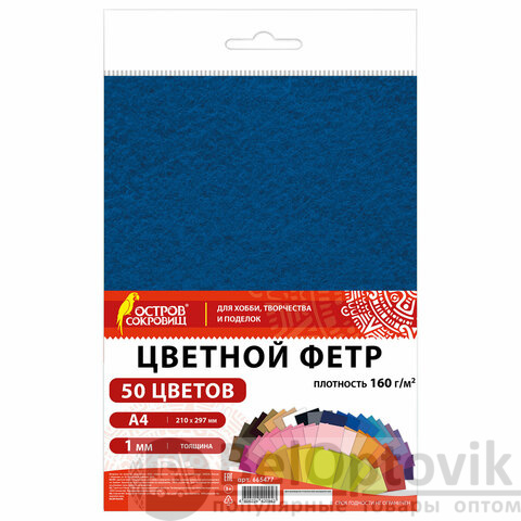 Цветной фетр А4, 1 мм, 50 л., 50 цветов, плотность 160 г/м2, ОСТРОВ СОКРОВИЩ, 665477
