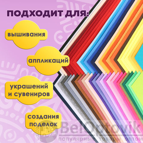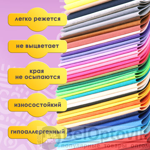 Плотность 160 г/м2 и толщина 1 мм гарантируют поделкам отличное качество и долгий срок службы. Цветной фетр формата А4 поставляется в упаковке по 50 листов (50 насыщенных цветов). Такое многообразие оттенков придется по вкусу самому взыскательному покупателю.