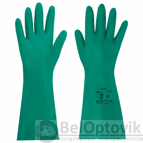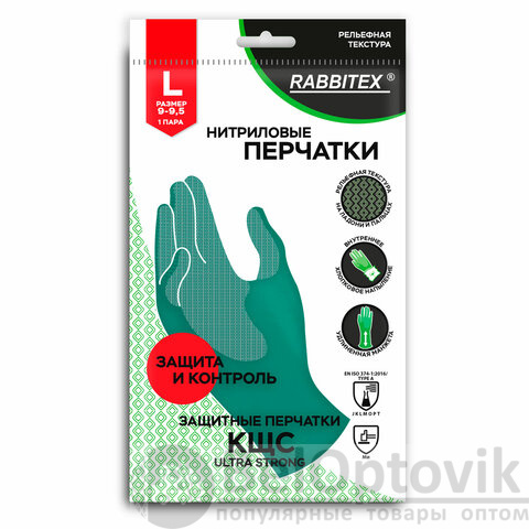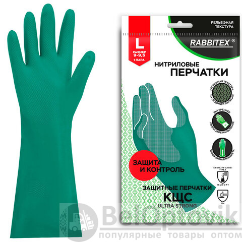 Перчатки нитриловые КЩС, ULTRA STRONG, хим. устойчивые, с хлопковым напылением, зеленые, р-р 9-9,5 L (большой), RABBITEX (РАББИТЕКС), 700912