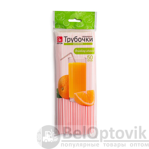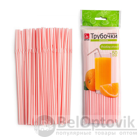 Трубочки для коктейлей гофрированные пластиковые 5х210 мм, белые с красной полоской, 50 шт., GRIFON, 105-050