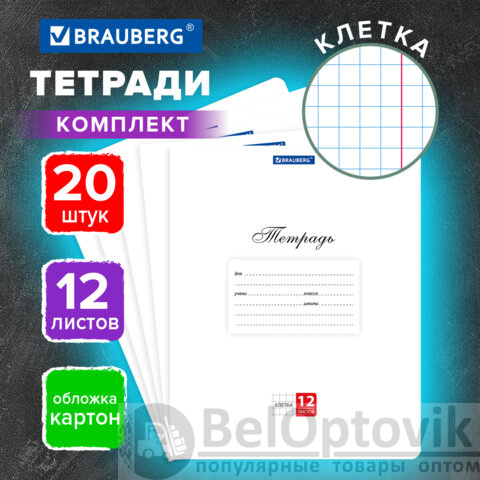 Тетради ДЭК 12 л. КОМПЛЕКТ 20 шт. BRAUBERG КЛАССИКА, клетка, обложка картон, БЕЛАЯ, 107071