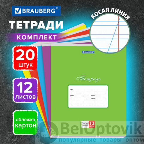 Тетради ДЭК 12 л. КОМПЛЕКТ 20 шт. BRAUBERG КЛАССИКА, косая линия, обложка картон, АССОРТИ, 107072