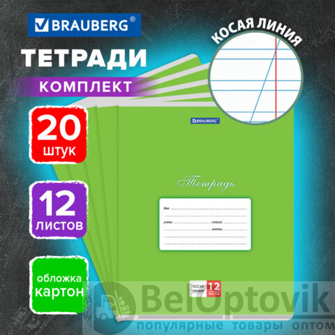 Тетради ДЭК 12 л. КОМПЛЕКТ 20 шт. BRAUBERG КЛАССИКА, косая линия, обложка картон, ЗЕЛЕНАЯ, 107073