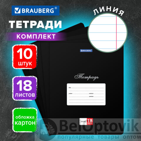 Тетради ДЭК 18 л., КОМПЛЕКТ 10 шт., BRAUBERG "КЛАССИКА", линия, обложка картон, ЧЕРНАЯ, 107087