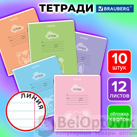 Тетради ДЭК 12 л. КОМПЛЕКТ 10 шт. BRAUBERG, линия, обложка картон, "УШИ-ЛАПЫ-НОС", 107324