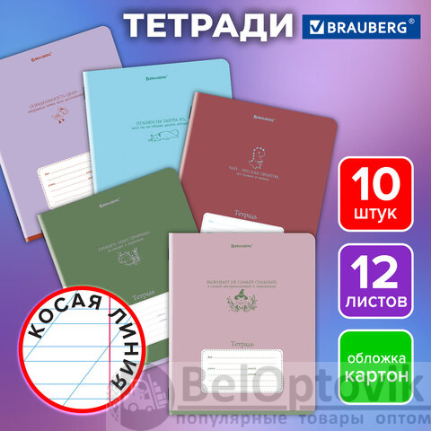 Тетради ДЭК 12 л., КОМПЛЕКТ 10 шт., BRAUBERG, косая линия, обложка картон, "PHRASES", 107328