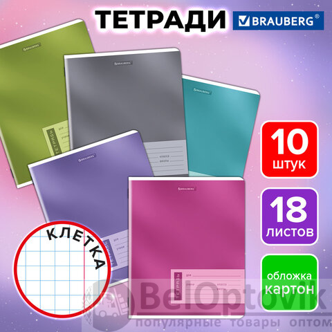 Тетради ДЭК 18 л. КОМПЛЕКТ 10 шт. BRAUBERG, клетка, обложка картон, "ONE COLOUR", 107332