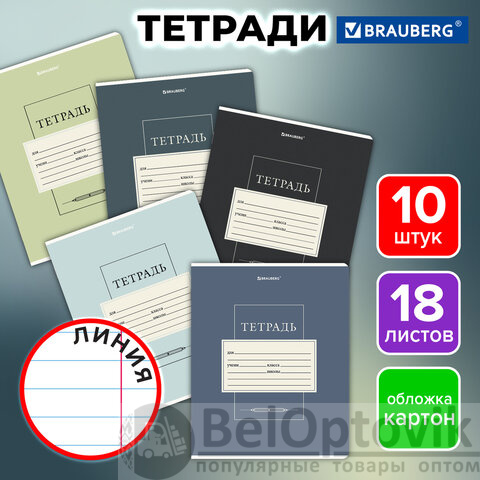 Тетради ДЭК 18 л. КОМПЛЕКТ 10 шт. BRAUBERG, линия, обложка картон, "CLASSIC", 107336